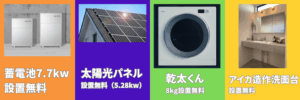 ご契約でガチャ抽選:蓄電池7.7kW/太陽光5.28kW/乾太くん8kg/アイカ造作洗面台など